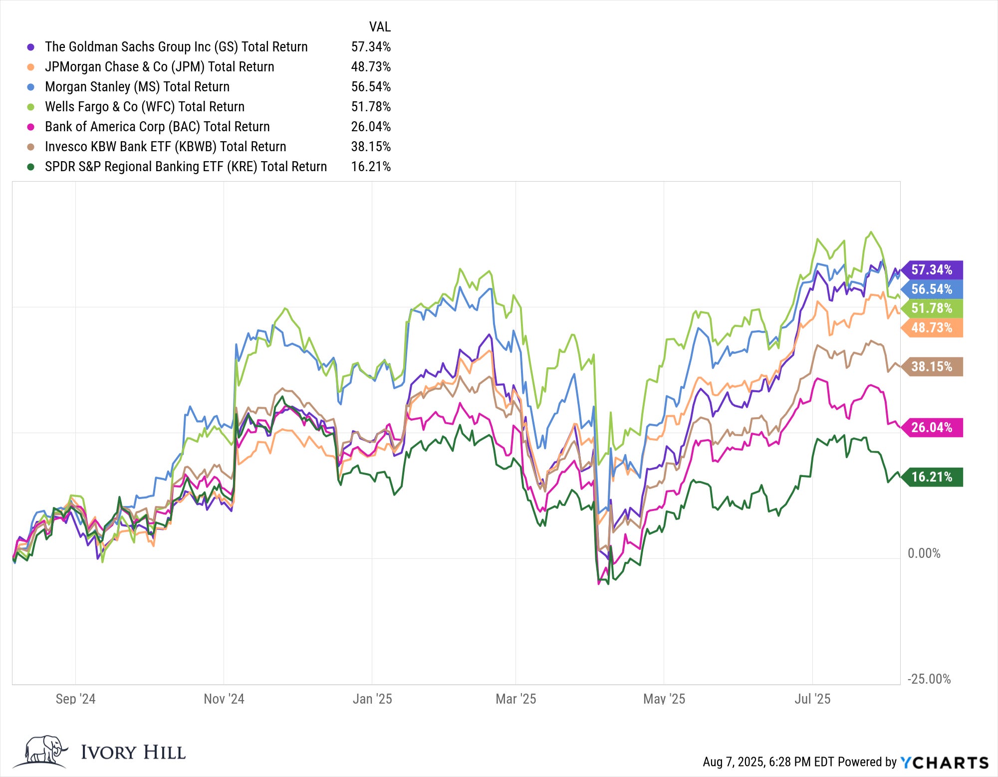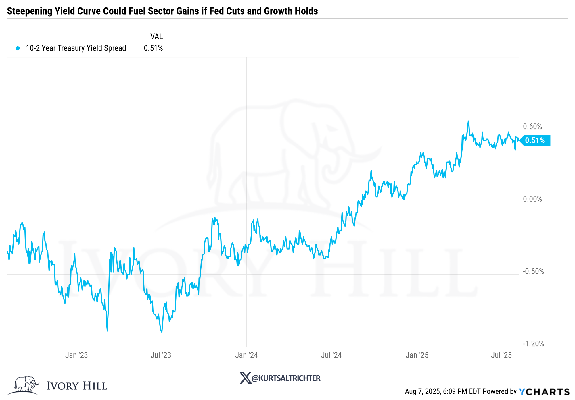 If rate cuts play out as the market anticipates through 2025 and into 2026, the 2-Year should keep falling, the curve should continue steepening, and these sectors could be prime beneficiaries. But if growth breaks down and long rates drop faster than short rates, that steepening tailwind flips to a headwind, with economic worries taking center stage.