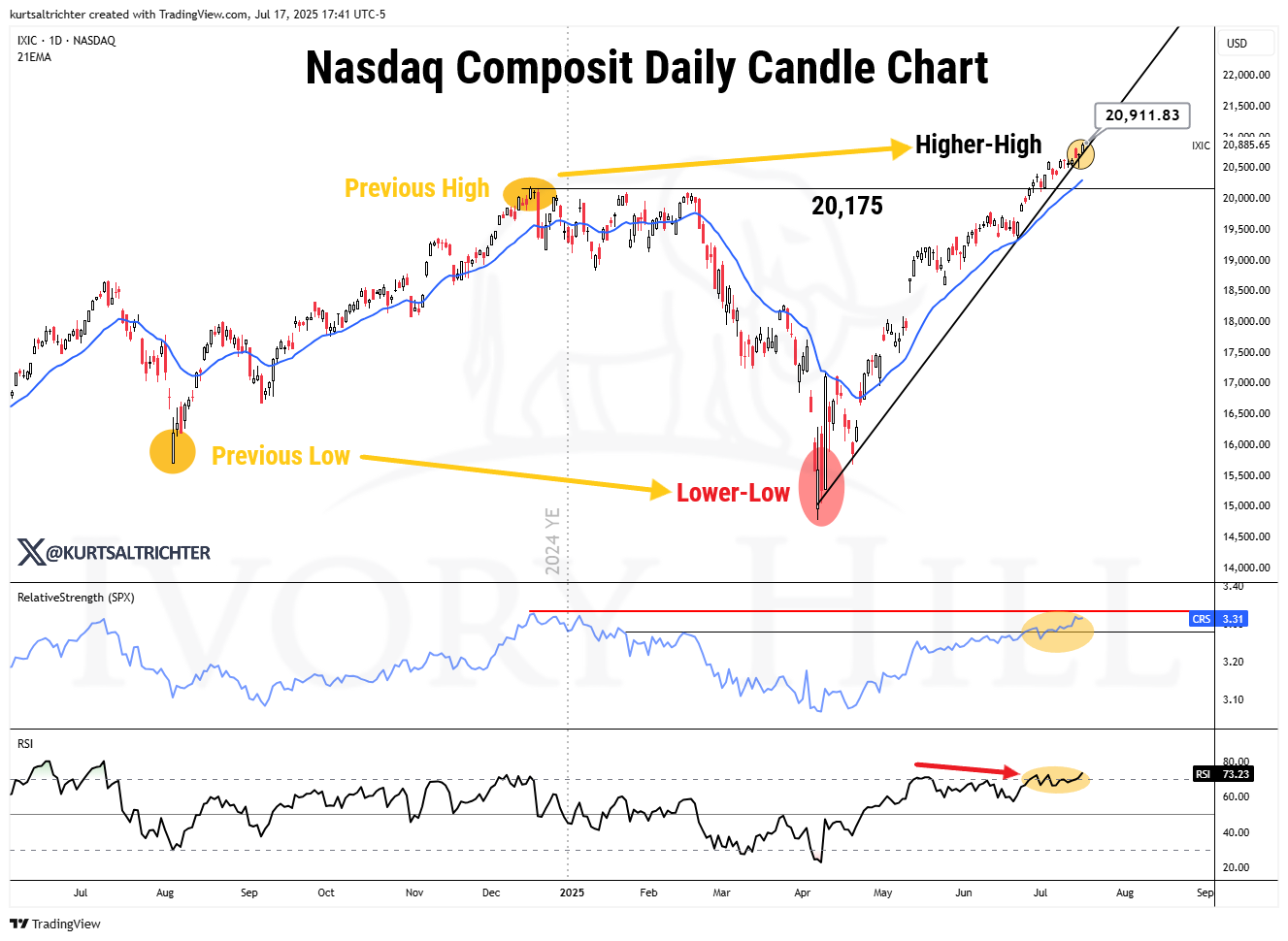 The Nasdaq has led this rally off the Q2 lows, but signs of exhaustion are building. Despite notching a higher high on the chart, RSI is flashing a bearish divergence, and relative strength to the S&P 500 is stalling. Leadership momentum is fading. With the index breaking slightly below short-term trend support, the risk is rising that tech could lead the next leg lower, just as it did on the way up. Any short-term weakness is a buying opportunity, but a break below 20,175 would be outright bearish.