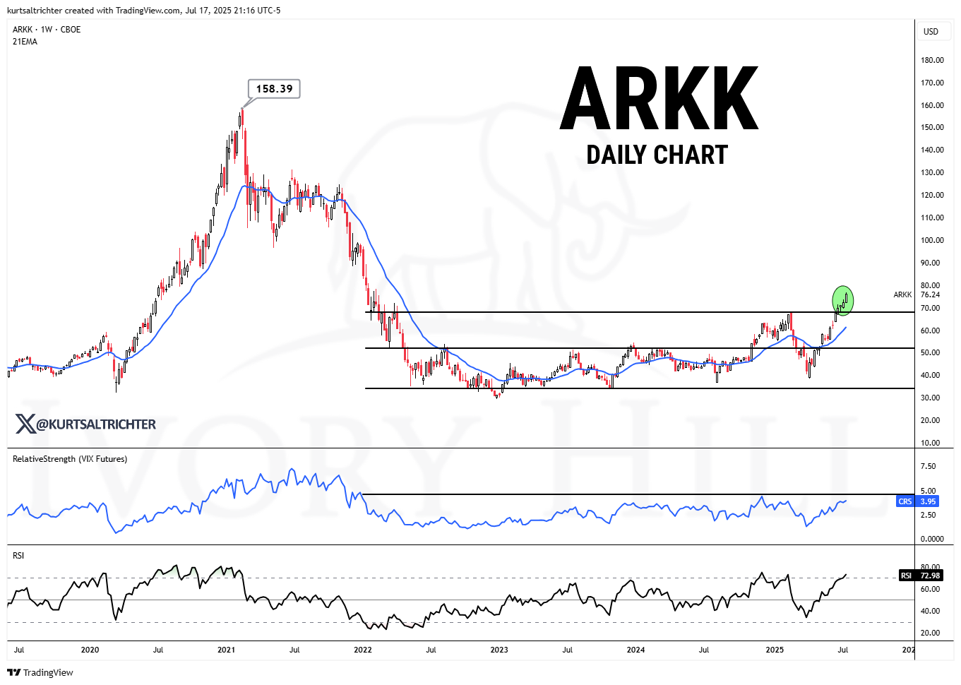 We also believe in the power of the deregulation narrative and expect rates to come down, whether through a political shake-up at the Fed or when Powell’s term ends in May 2026. Either path points to lower rates ahead, and when paired with deregulation, that’s a bullish cocktail for small- and mid-cap stocks. That’s why we’re not just long IWM and TNA, we’re also positioned in ARKK to capture the upside in high-beta innovation names, otherwise known as profitless tech.