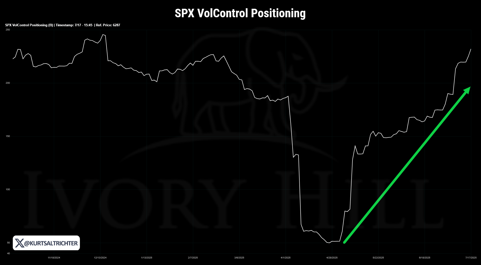 CTA and Vol Control strategies have been ramping up equity exposure as volatility trends lower, mechanically buying without regard to fundamentals or price. These flows have supercharged the rally, as shown in the sharp climb in both CTA and VolControl positioning charts.