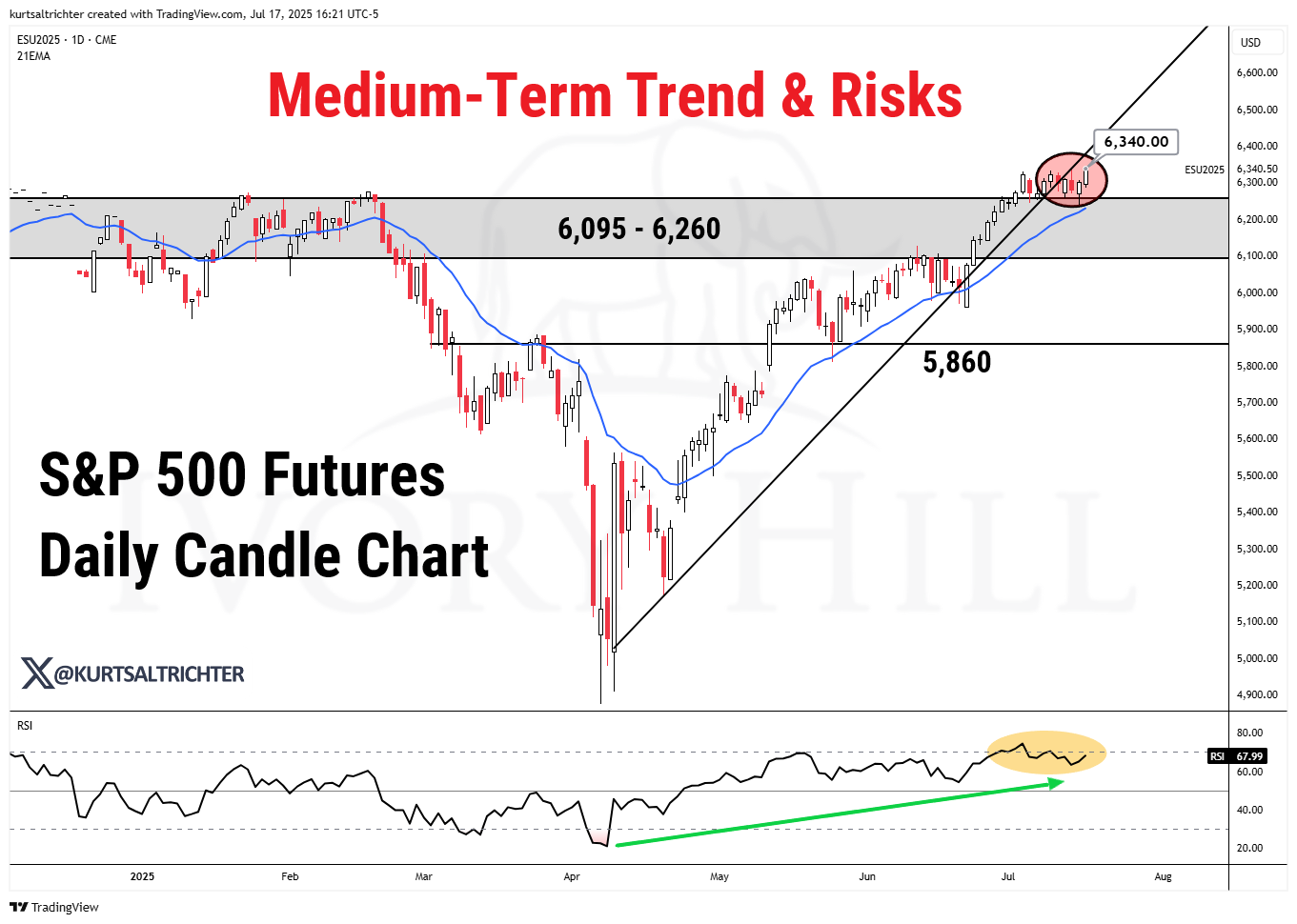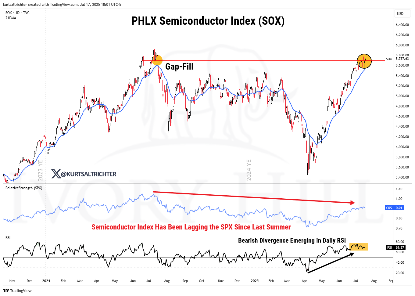 The SOX is knocking on the door of its all-time highs, but the setup beneath the surface is far from convincing. Bearish divergence is taking shape in the daily RSI, and the index continues to lag the S&P 500, an issue that’s persisted since last summer. Momentum is fading just as price fills the final gap. If semiconductors roll over here, the rest of the market is going to follow.
