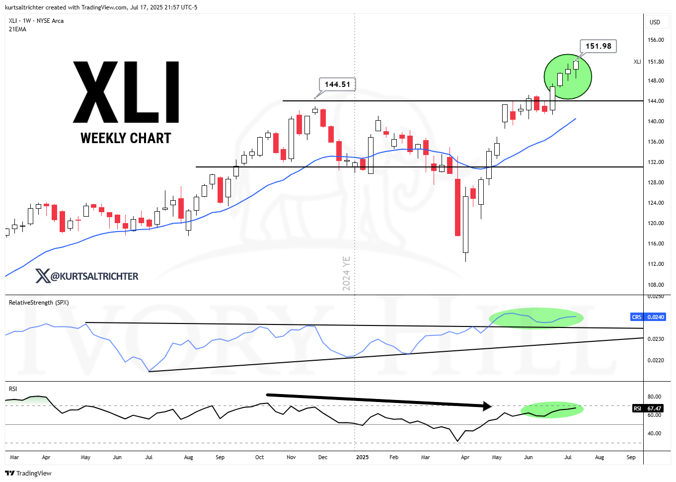Industrials are currently the strongest sector in the S&P 500, breaking out of their recent downtrend and gaining momentum as cyclicals come back into favor. XLI is showing broad-based strength, clearing prior resistance, improving in relative strength, and pushing higher on RSI, all supported by solid buying pressure. That said, the setup isn’t bulletproof. Trade tensions remain a risk, but for now, optimism around infrastructure investment and the Trump tax plan is tilting the scales in favor of industrials. We're still early in the move, and any short-term weakness looks like a buying opportunity.
