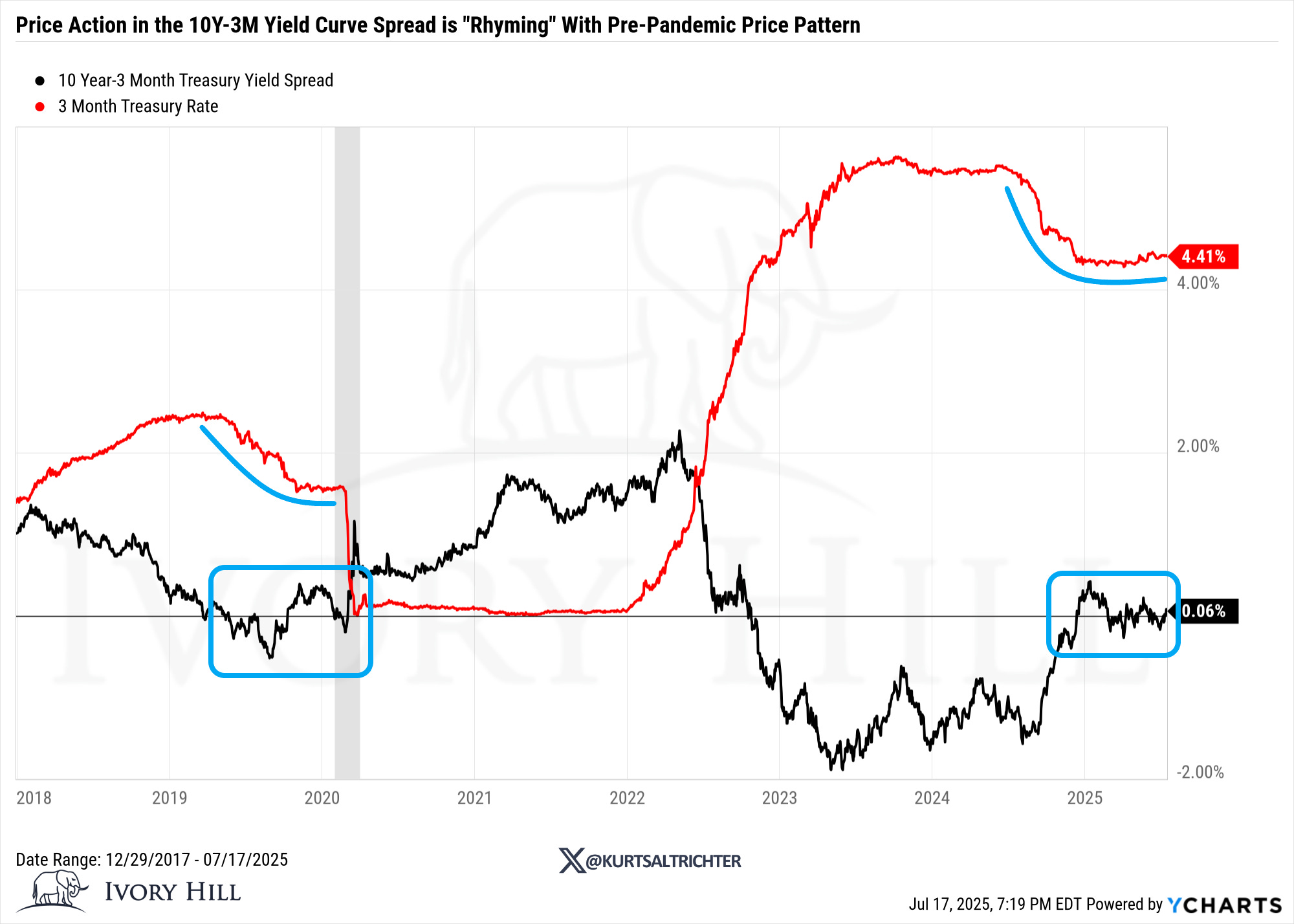 The 10Y–3M yield curve is emerging from a deep inversion in a way that eerily mirrors the 2019 pre-COVID crash setup. Just like before the pandemic crash, we’re seeing the 3-month Treasury rate flatten while the spread grinds sideways around zero. History shows this “holding pattern” tends to resolve into economic weakness, not acceleration. The market may be obsessed with AI and soft-landing narratives, but yield curves are flashing a different message: this cycle isn’t done with us yet.