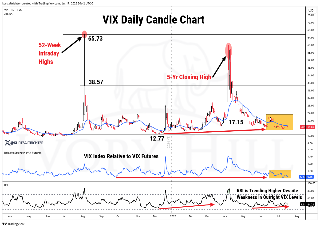 The VIX just logged fresh 5-month lows, but don’t get too comfortable. Despite outright weakness in the index, both RSI and relative strength to VIX futures are trending higher, classic signs of a bullish divergence in volatility, not stocks. With the short-volatility trade becoming increasingly crowded and the calendar spread nearing extreme levels, the setup is ripe for a resurgence in volatility. Few are positioned for it, but the risk is building under the surface.