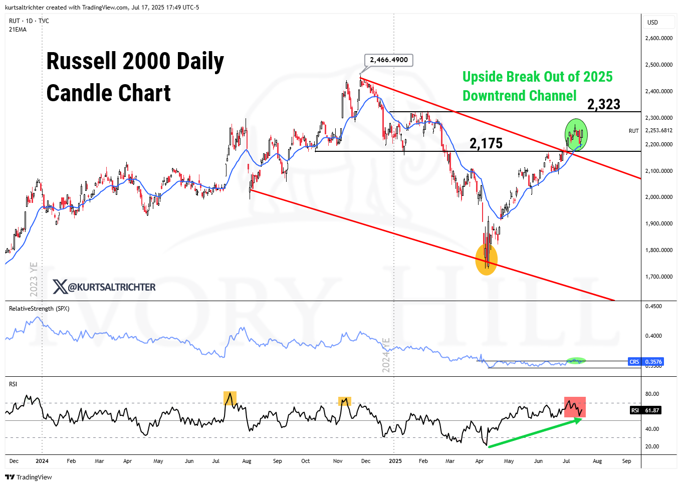 Technically, the Russell 2000 just broke out of its 2025 downtrend channel, reclaiming the 2,323 level. That’s an encouraging development, but it still lacks confirmation. Bearish RSI divergence and weak relative strength versus the S&P 500 remain red flags. Until we see fresh highs with improving momentum, this move still looks like a counter-trend rally inside a broader downtrend. That said, we’re positioned for the upside and have been long small caps via IWM and TNA.