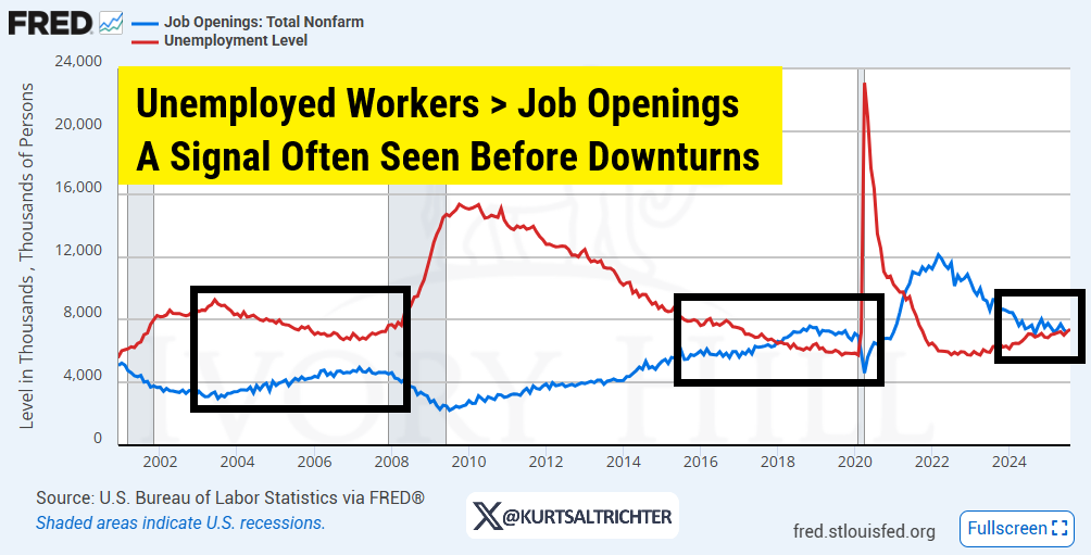 Job openings, measured by the JOLTS survey, typically rise during healthy expansions while unemployment falls. But in 2025, the lines have flipped: the total unemployed now exceeds the number of available jobs. That’s a meaningful shift, one we last saw ahead of past slowdowns. It doesn’t scream “recession now,” but it’s a cyclical warning sign worth respecting.