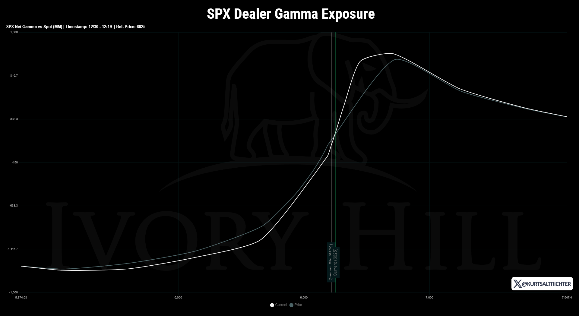 Dealer gamma on the S&P 500 has shifted back into positive territory near 6,625, meaning options dealers are once again long gamma around the current spot. When dealers are long gamma, they tend to suppress volatility by buying dips and selling rips, which can help stabilize price action and keep intraday swings more contained. If spot breaks below this zone and dealers flip back to short gamma, the market could see sharper, more directional moves.