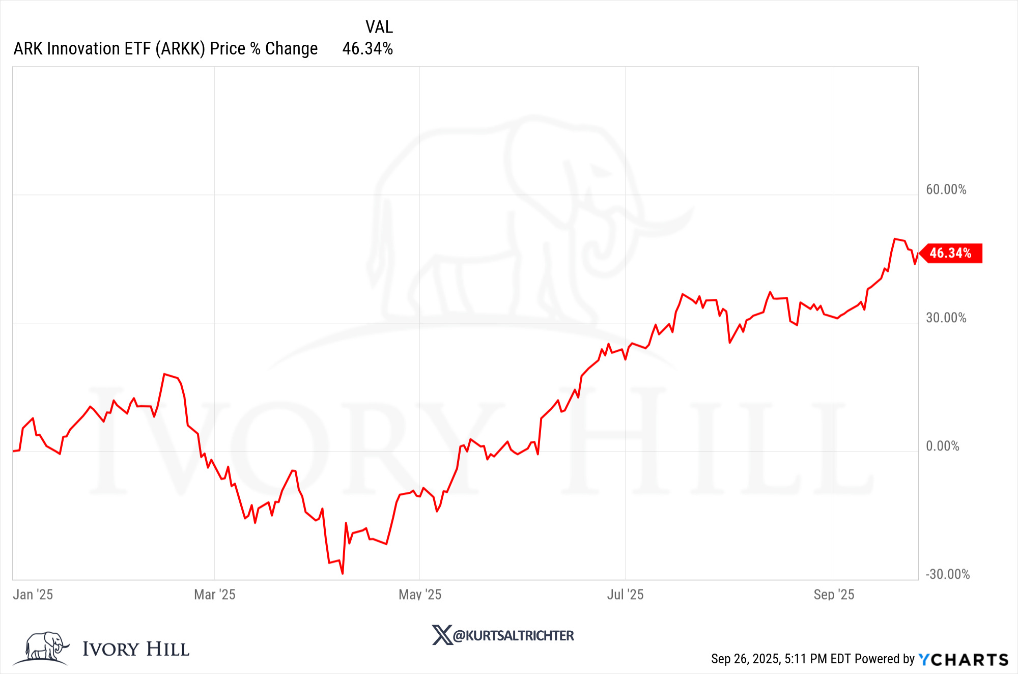 The market’s leadership has quietly been broadening beyond the mega-cap tech names that dominated earlier this year. High-beta growth themes and profitless tech have come back to life, and our positioning in ARKK has been a standout example. After a choppy start, the ETF has rallied strongly and remains up more than 45% year-to-date, validating our strategy of leaning into small- to mid-cap growth as market participation widens.