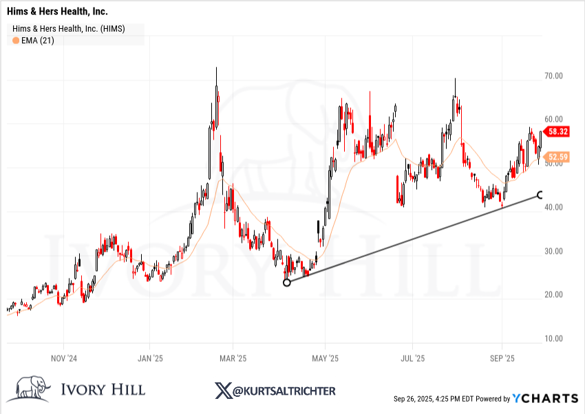 HIMS is in a constructive long-term uptrend, now retesting support with a chance to resume higher. It offers a defined entry with risk below the rising trendline, ideal for those looking to participate if the stock continues building on its higher-low structure.
