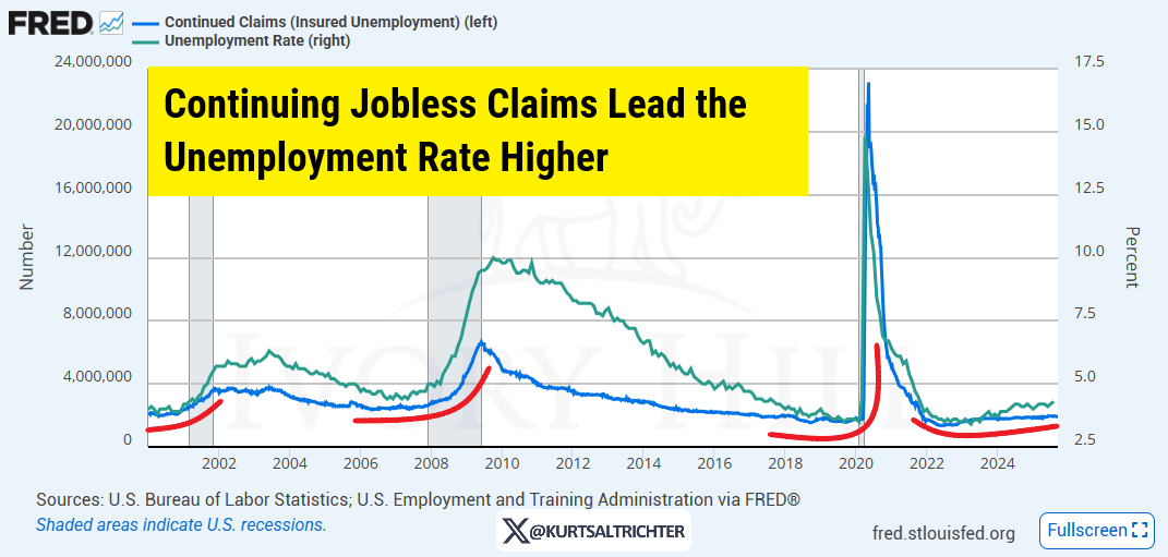 Continuing jobless claims tend to turn higher before the official unemployment rate follows. Both series are now trending upward toward four-year highs. Historically, there hasn’t been an exception to this relationship in the modern era. If claims continue to rise, the headline unemployment rate typically follows, and markets eventually take notice.