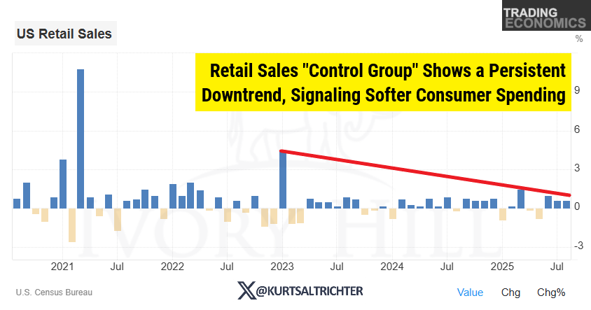Consumer spending accounts for two-thirds of the U.S. GDP. The “control group” retail sales measure, which filters out volatile categories, has been trending lower since 2023. It’s not collapsing, but the slowdown suggests less fuel for growth going forward, especially if labor softens further.