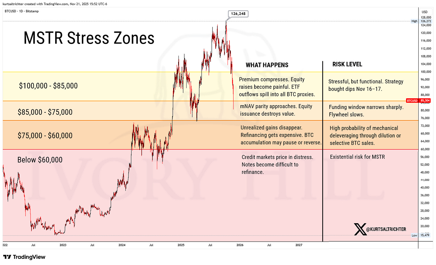 Here is the truth nobody wants to spell out clearly. There are no BTC price liquidation triggers for MSTR. Everything is driven by how quickly the premium collapses, how expensive credit becomes, and whether passive flows remain intact.