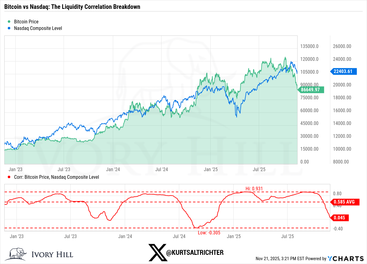 A correlation unwinding from 0.93 toward zero does not happen in healthy liquidity conditions. It happens when the tape is repositioning into tighter financial conditions, and the speculators get hit first.