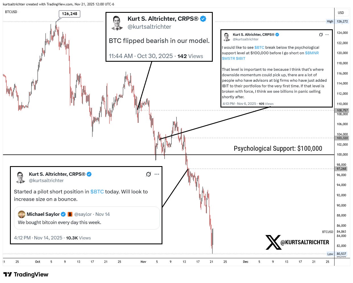 My model flipped Bitcoin into a bearish regime at the end of October. That was the first sign the character of the tape had changed. A few days later, I warned that 100k was the line that mattered. Once that level broke, you would get forced selling, not dip-buyers. And when that break came, I stepped in on the short side. I did not chase the first move down. I waited for the inflection.
