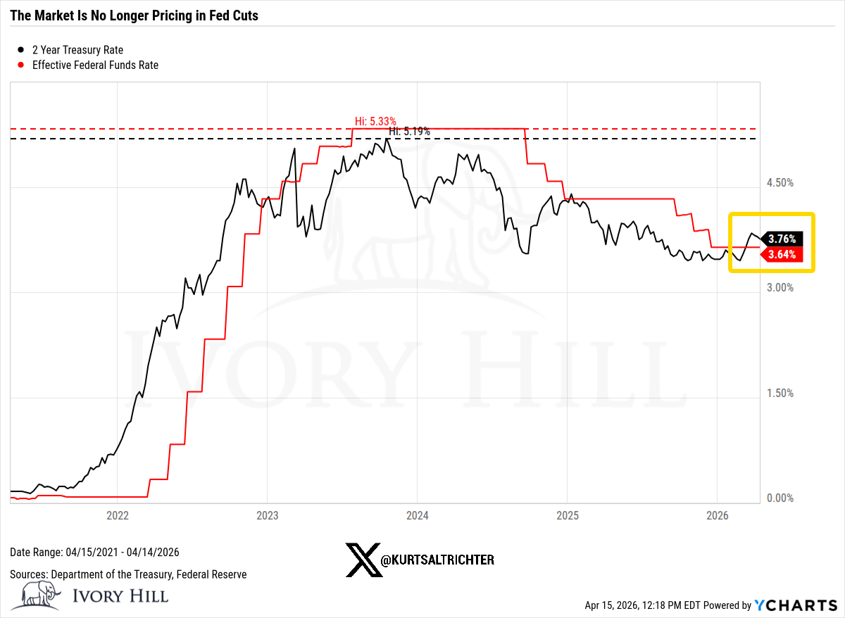 And the 2-year yield sitting 40 basis points above pre-war levels is a direct challenge to the Fed cut narrative. The 2-year is the most rate-sensitive instrument we have to look at. It tracks Fed expectations more closely than anything else. Right now, it's saying the Fed has less room than you think, and that matters for every valuation argument supporting this equity rally.