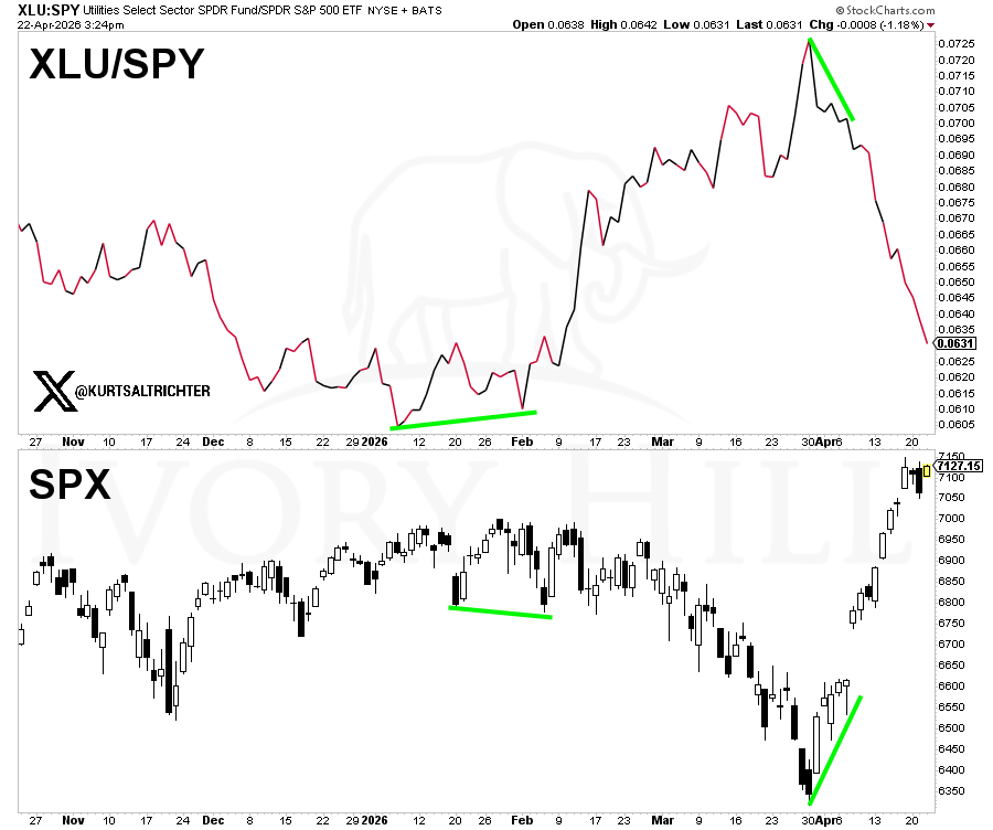 Versus the S&P 500, Utility stocks are handily underperforming.