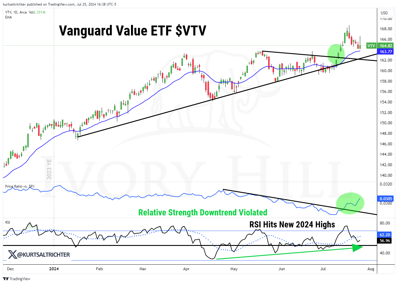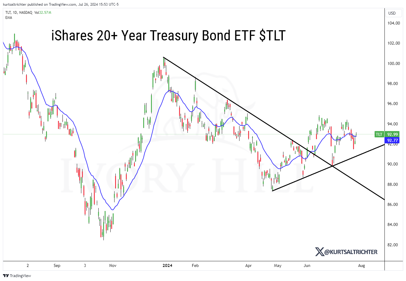 The 20-year Treasuries were in a clear downtrend, but the news that inflation is softening is now being reflected in bonds. TLT broke above its resistance line and is now forming a series of higher highs and higher lows. It's early, but everyone should keep a close eye on the bond market, as it will likely provide significant insights into the direction of inflation.