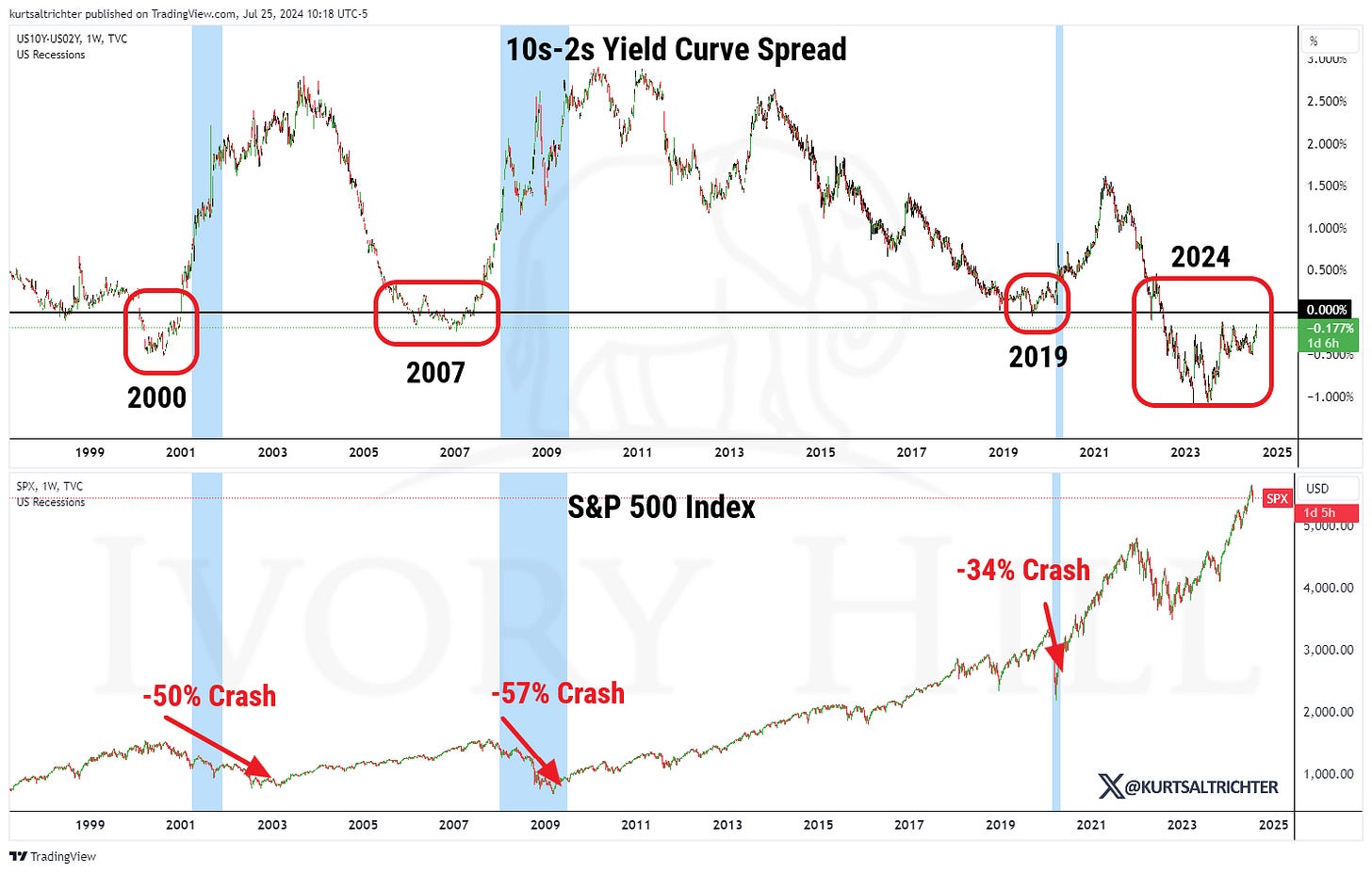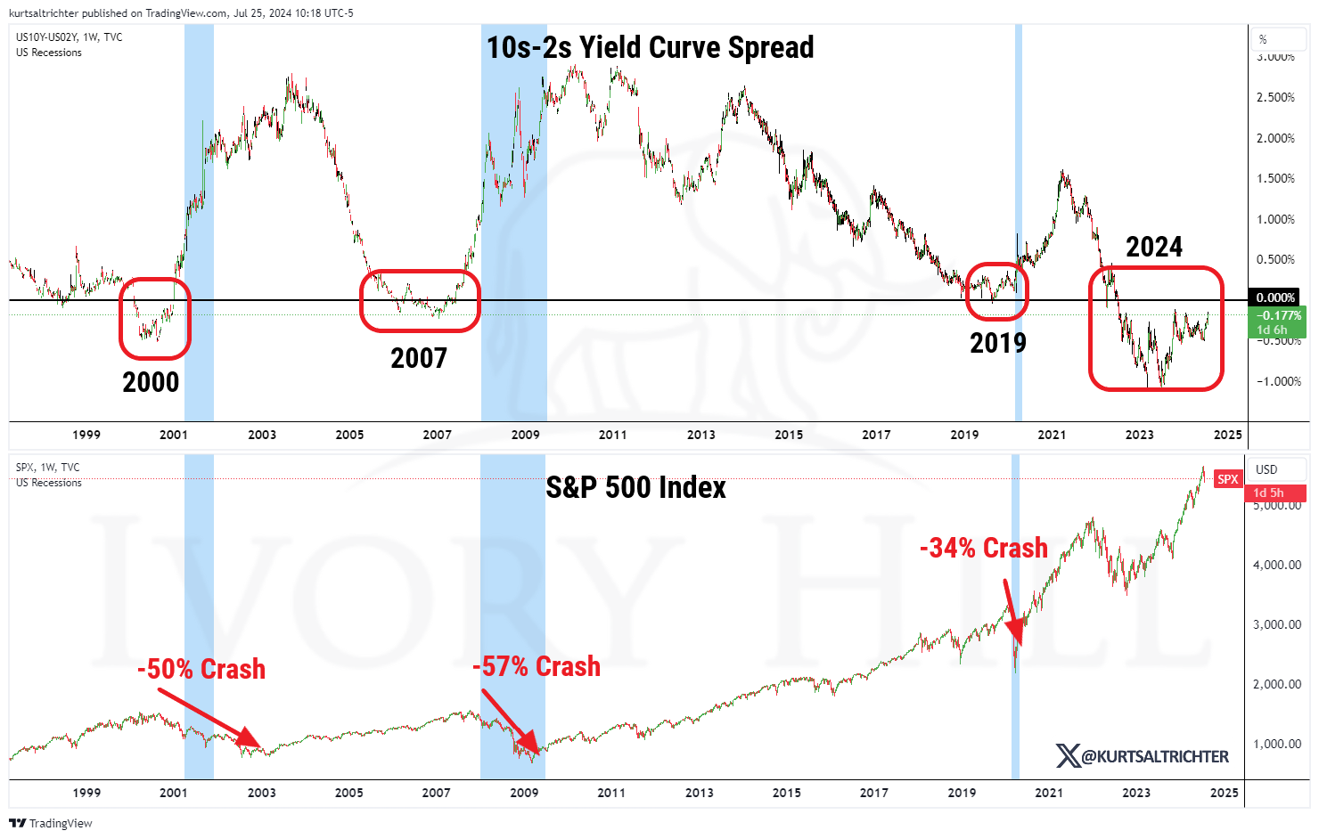 Over the past few years, I've consistently emphasized that this scenario sets a concerning precedent for the stock market. Historically, the last two times the yield curve inverted for this long and then turned positive, the S&P 500 plummeted by over 30% and took more than five years to recover to new highs.