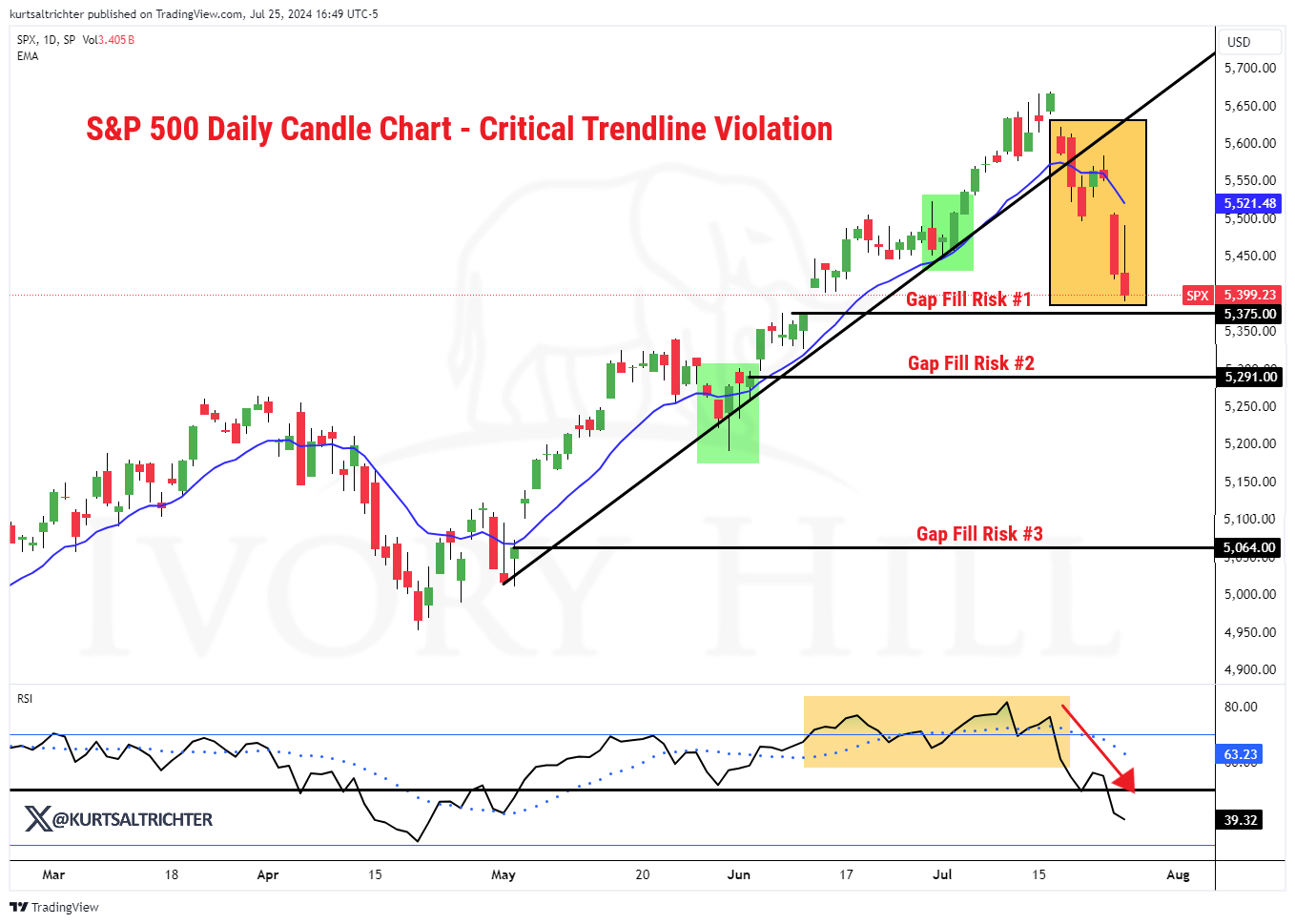 The blue uptrend line on the S&P 500 chart below has been a crucial support level since the April pullback. However, its breach last week signifies a loss of bullish momentum and a shift in the short-term market trend from upward to sideways, with an increased risk of downside gaps to 5,375, 5,291, and 5,064. Additionally, the index has now fallen to within 100 points of its 50-day moving average (MA) for the first time in several months.
