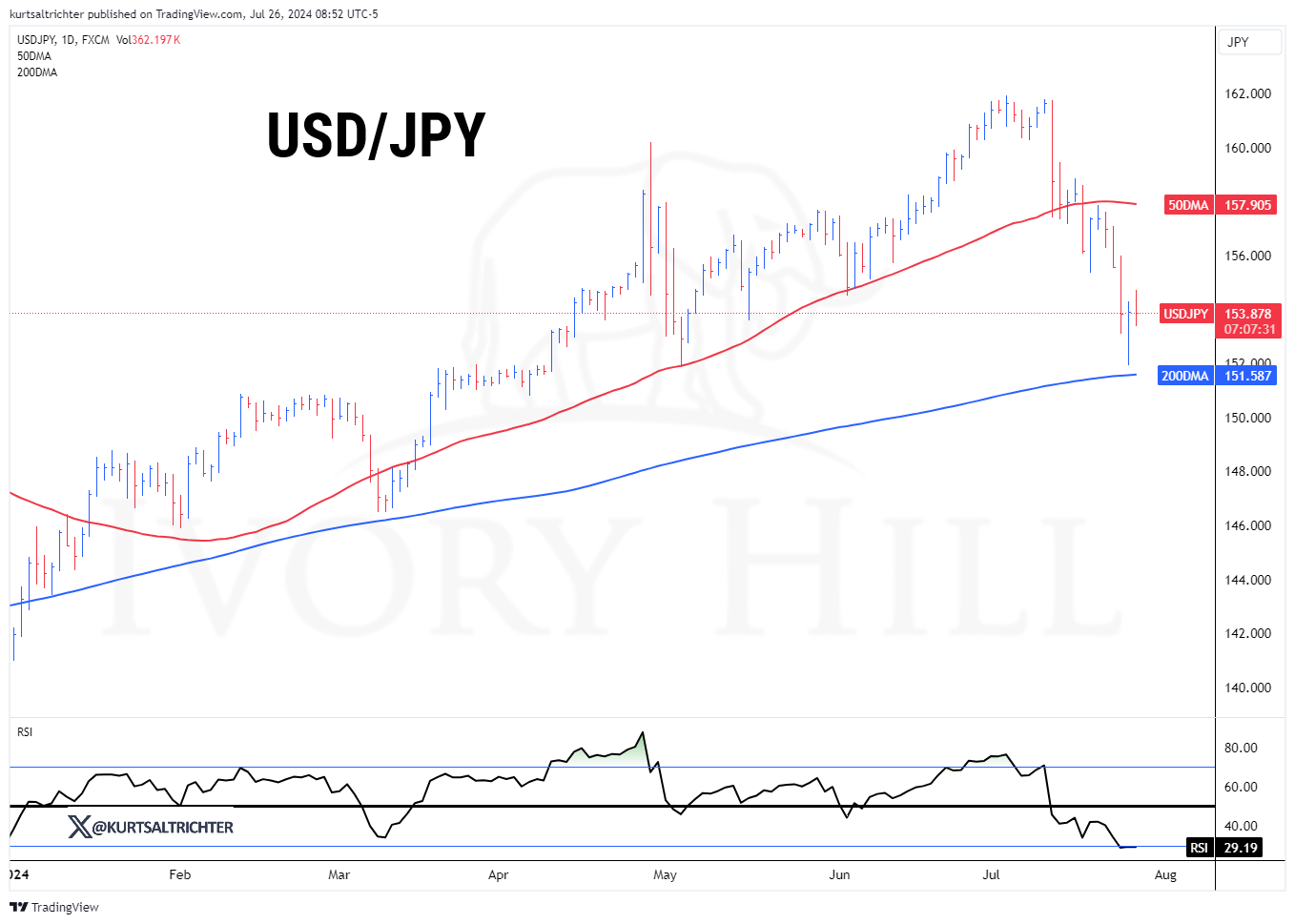 While the yen carry trade is not yet unwinding, it’s something to watch closely. The yen has strengthened over 5% against the greenback in the last month, primarily due to BOJ intervention. This strength is likely to have a mild impact on risk assets.