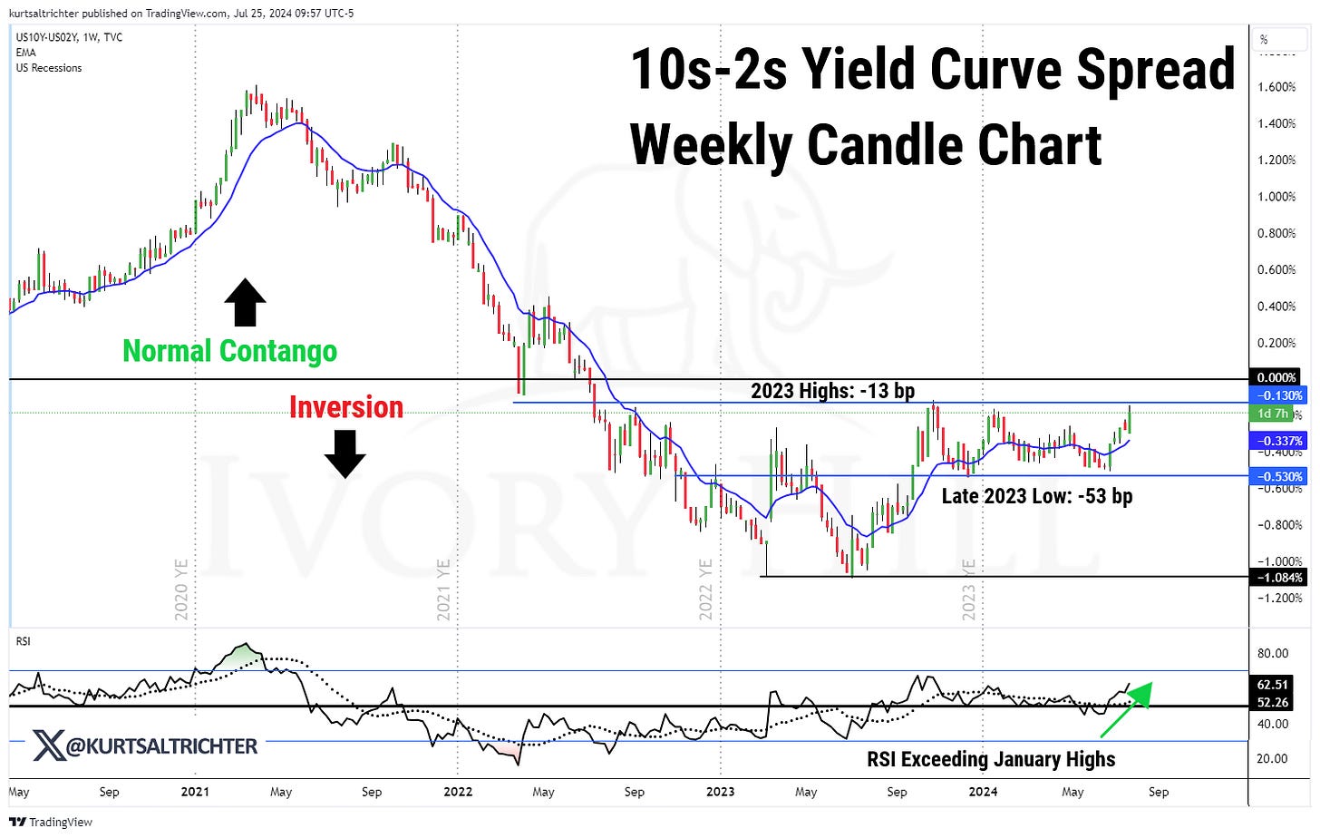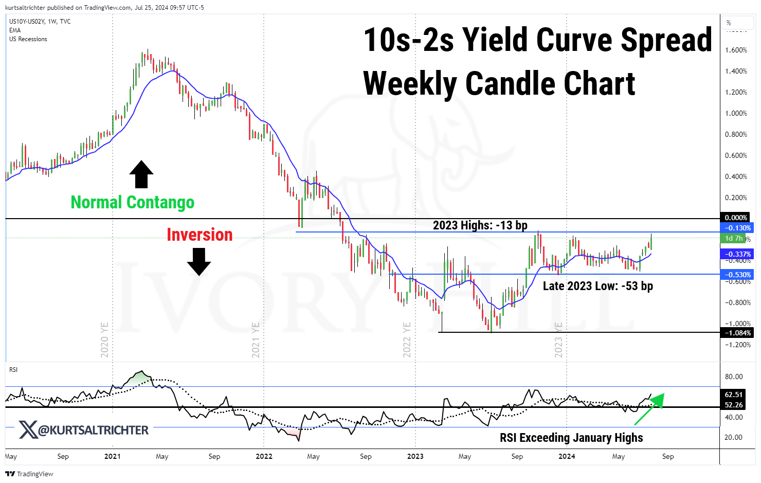 This pullback does not currently include growth worries, but we must monitor this closely. If growth concerns arise, the situation could worsen. Although recent data has been "ok," the rising 10s-2s yield spread, now at its highest level since July 2022, indicates potential risk.